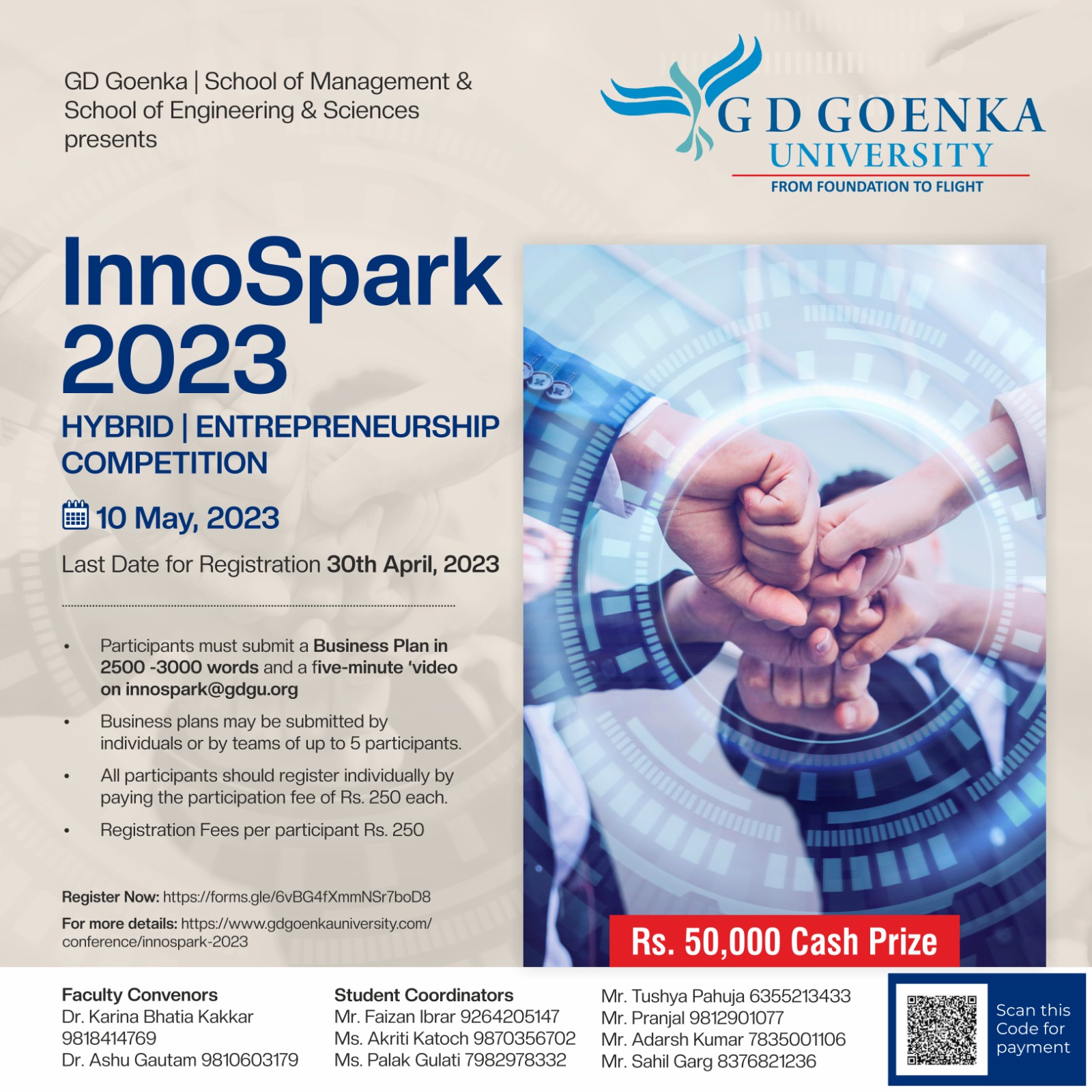 Entrepreneurship Skills are essential for a robust Startup Ecosystem. The government of India has envisioned making India a hub of entrepreneurial activities. This will catapult India to become a country of start-ups on the global stage. Hence, the School of Management and the School of Engineering & Sciences at GD Goenka University are the co-hosts for InnoSpark-2023 at the University Campus located in Sohna.