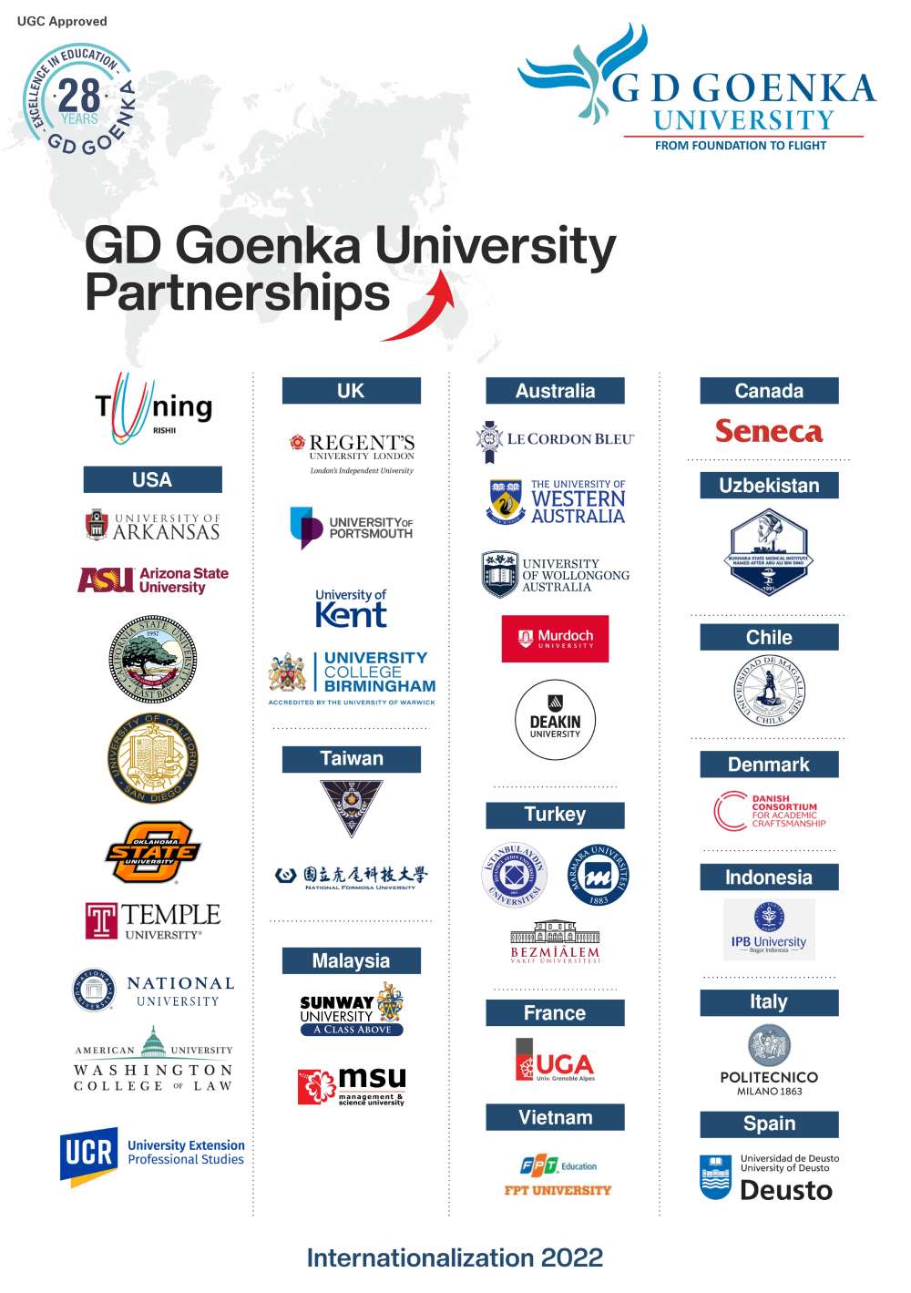 To-date, G D Goenka University has concluded thirty-five partnerships with universities in fifteen countries: USA, UK, Australia, Canada, France, Vietnam, Italy, Uzbekistan, Chile, Turkey, Indonesia, Malaysia, Taiwan, Denmark and Spain. Discussions are underway to substantially expand this global network substantially.