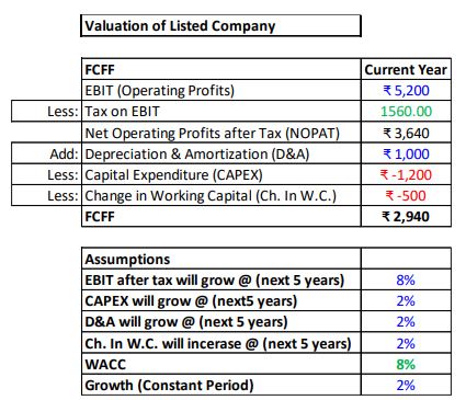 Mr. Arora provided the input values as seen above and the WACC came out to be 8.01%. On the 2nd screenshot we calculated the Free Cash Flow to Firm (FCFF) as follows: