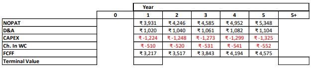 Post Calculation of the FCFF, Mr. Arora helped us calculate Future Cash Flows using the growth assumptions as above for the respective line items below. Each subsequent Cash Flow was calculated by multiplying the previous cash flow by (1+ assumed growth rate in %). Unfortunately, since this was a simplified Financial Modelling template for beginners and as the session came to an end, topics of DCF and terminal value had to be adjourned for a future session.