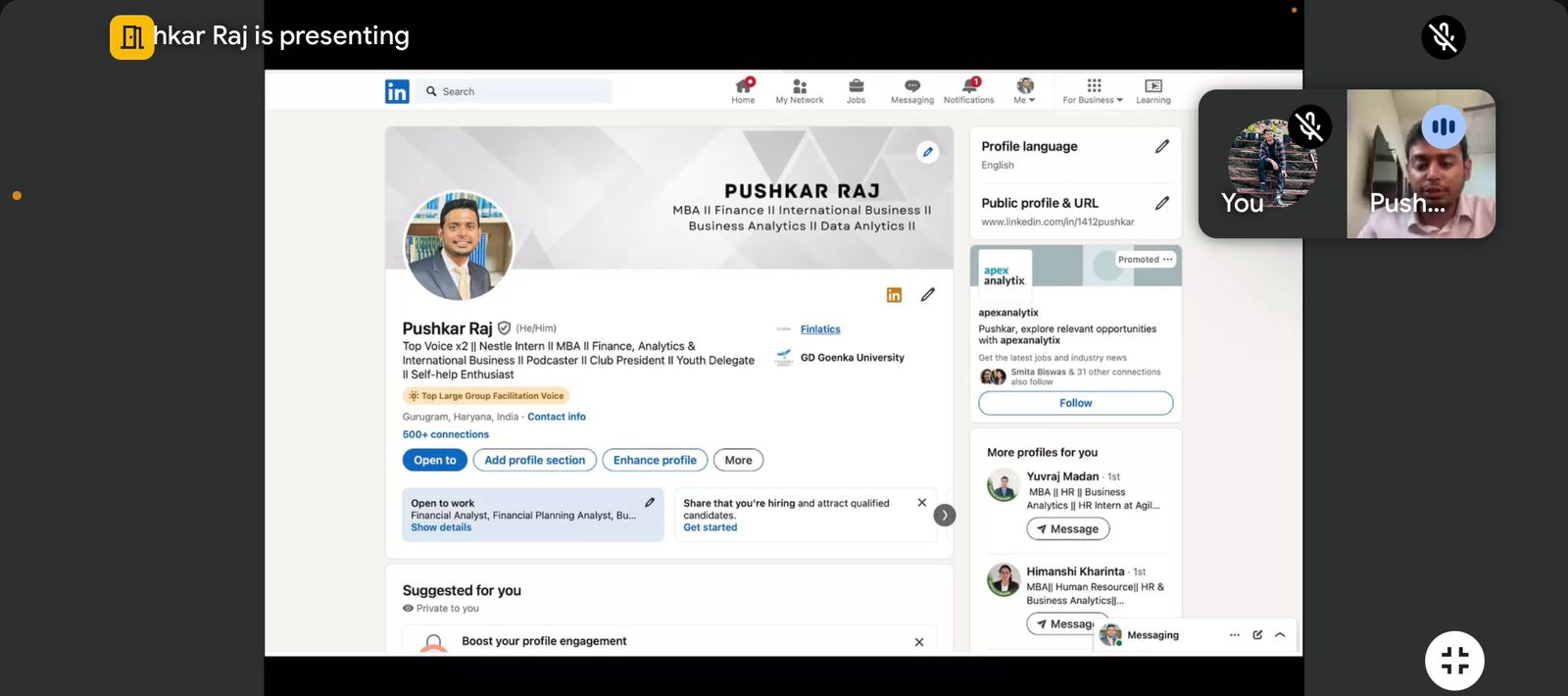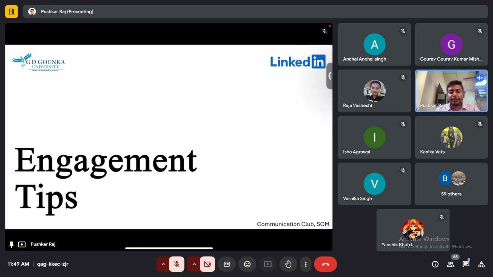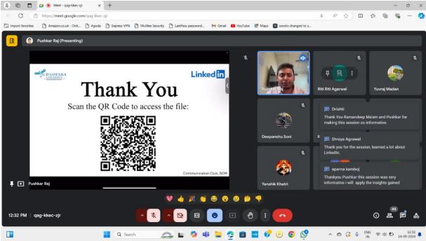 On 14th September 2024, the Communication Club of GD Goenka University conducted an insightful session on LinkedIn optimization. The event, hosted by Pushkar Raj and coordinated by Dr. Ramandeep Kaur, aimed to help students enhance their LinkedIn profiles, increase engagement, and improve networking strategies for professional growth. The session provided attendees with practical tips and strategies to leverage LinkedIn for their professional development.