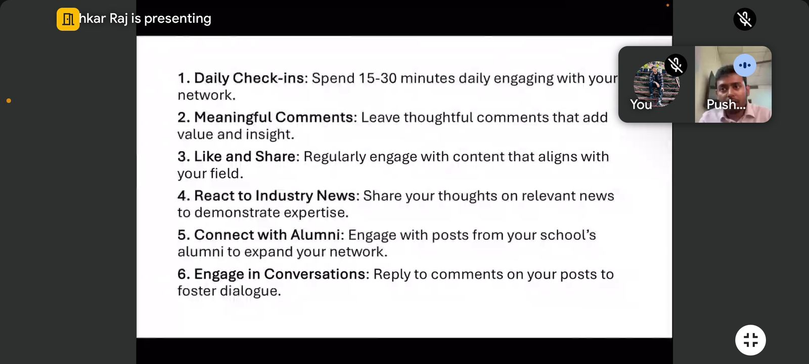Next, the session provided valuable Engagement Tips to help attendees remain active and visible on LinkedIn. Participants were advised to engage with their network daily by leaving thoughtful comments, liking and sharing relevant posts, and reacting to industry news. They were encouraged to connect with alumni, respond to comments on their own posts, and use visuals such as images or videos to enhance engagement. The importance of regular interaction was highlighted as a key factor in building a strong professional presence on the platform.
