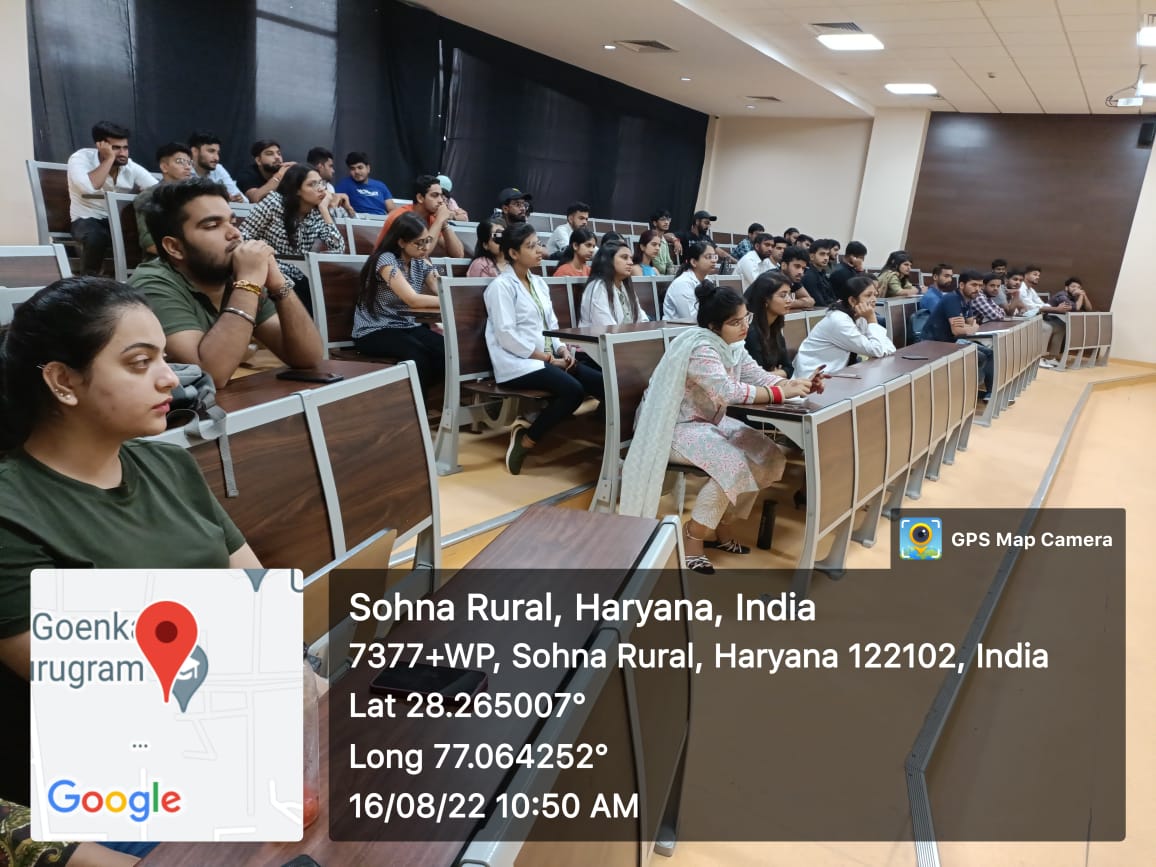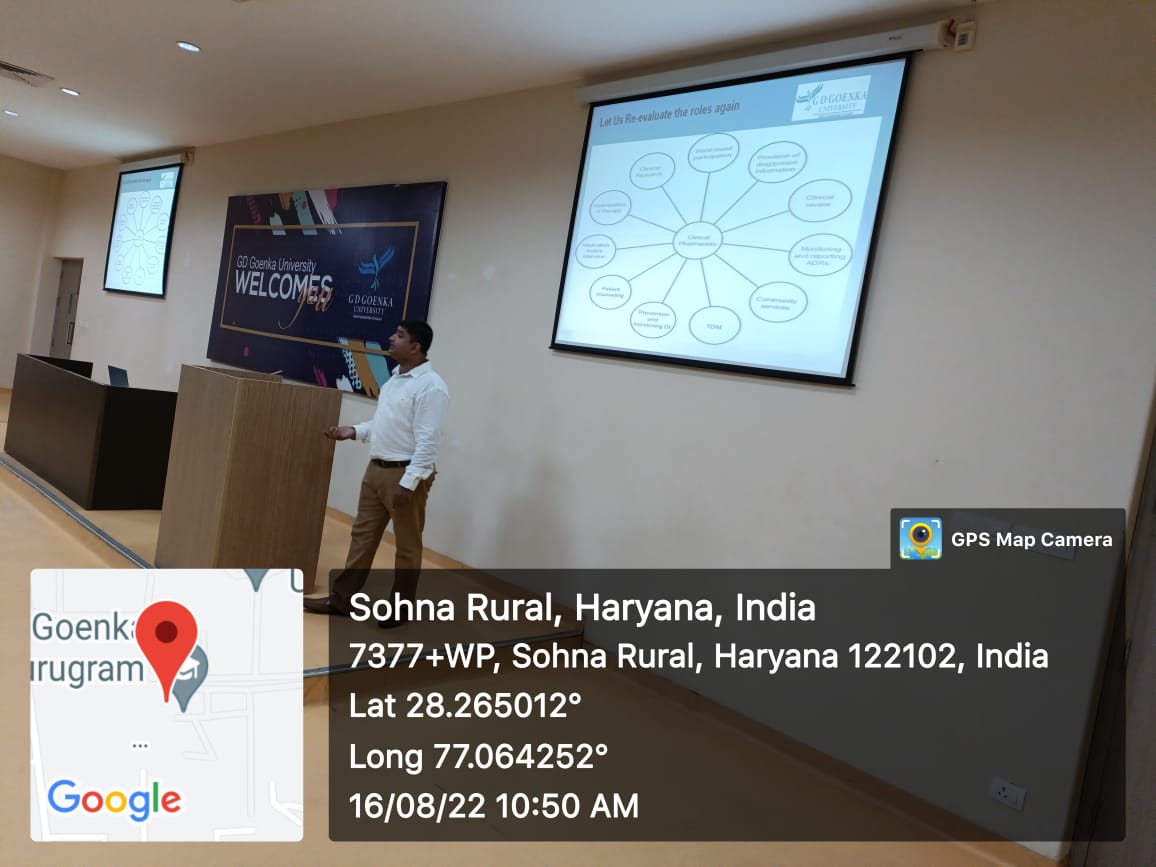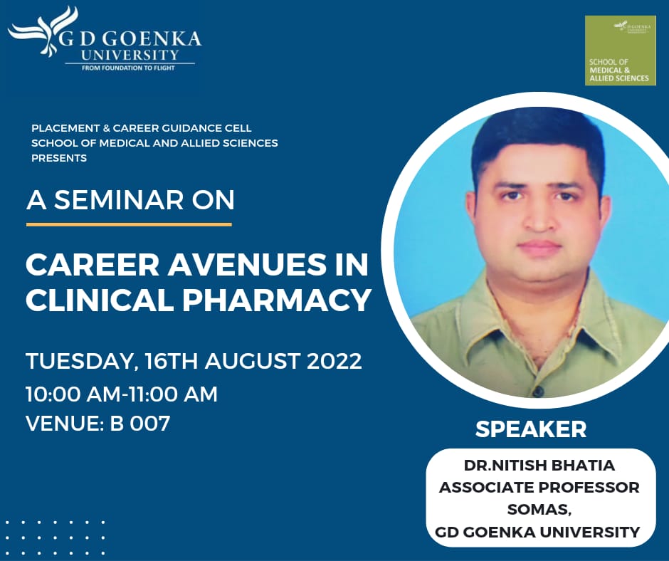 School of Medical and Allied Sciences, GD Goenka University conducted a seminar on ‘Career Avenues in Clinical Pharmacy’ on August 16, 2022 for the students of M.Pharmacy and B.Pharm final Year.The seminar was delivered by Dr. Nitish Bhatia, Associate Professor at GD Goenka University. Dr. Bhatia shared his views about the prospects of clinical pharmacy as a career opportunity for pharmacy graduates and explained the skill set required to become a clinical pharmacist.