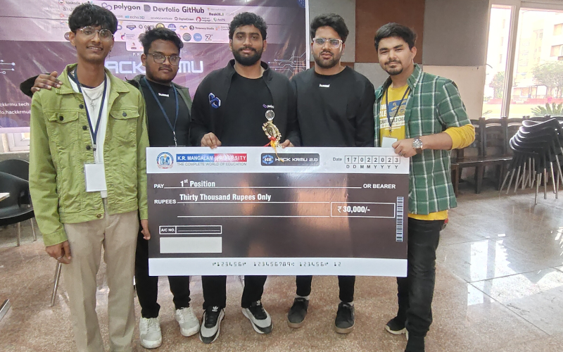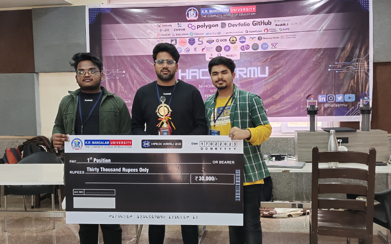 In yet another Hackathon, GD Goenka University Team RYM Grenergy won First Position with a cash prize of ₹30,000 rupees with a trophy, goodies, and certificates at Hackathon organized by K.R. Mangalam University from 15th February to 17th February 2023.