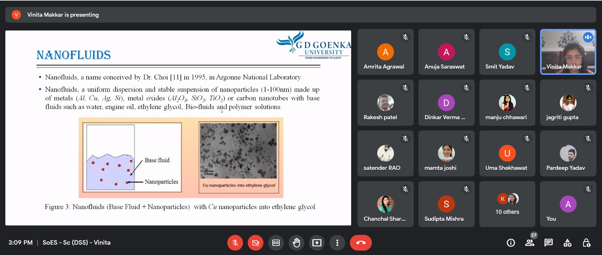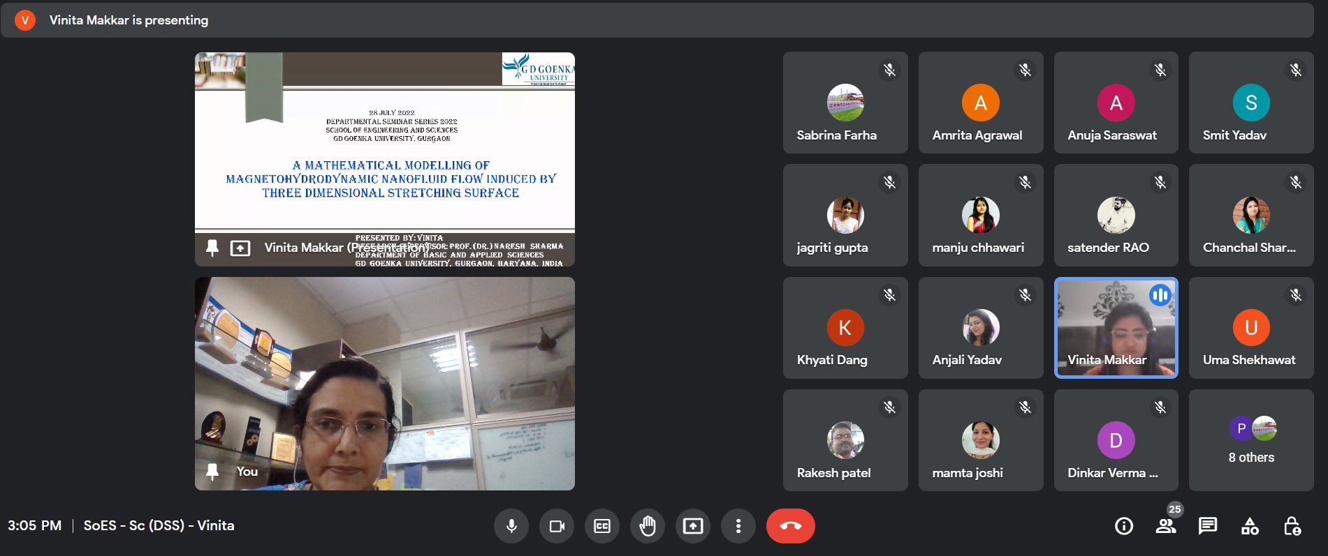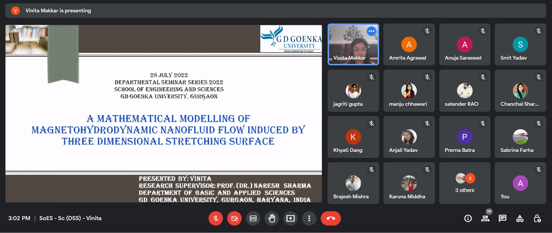 School of Engineering & Sciences (SoES), GD Goenka University organized a Departmental Seminar Series on 28 July 2022. Ms. Vinita Makkar, a research scholar in Mathematics, under the supervision of Prof. (Dr.) Naresh Sharma, has delivered a talk on ‘A Mathematical Modelling of Magnetohydrodynamic Nanofluid Flow Induced by Three Dimensional Stretching Surface’.