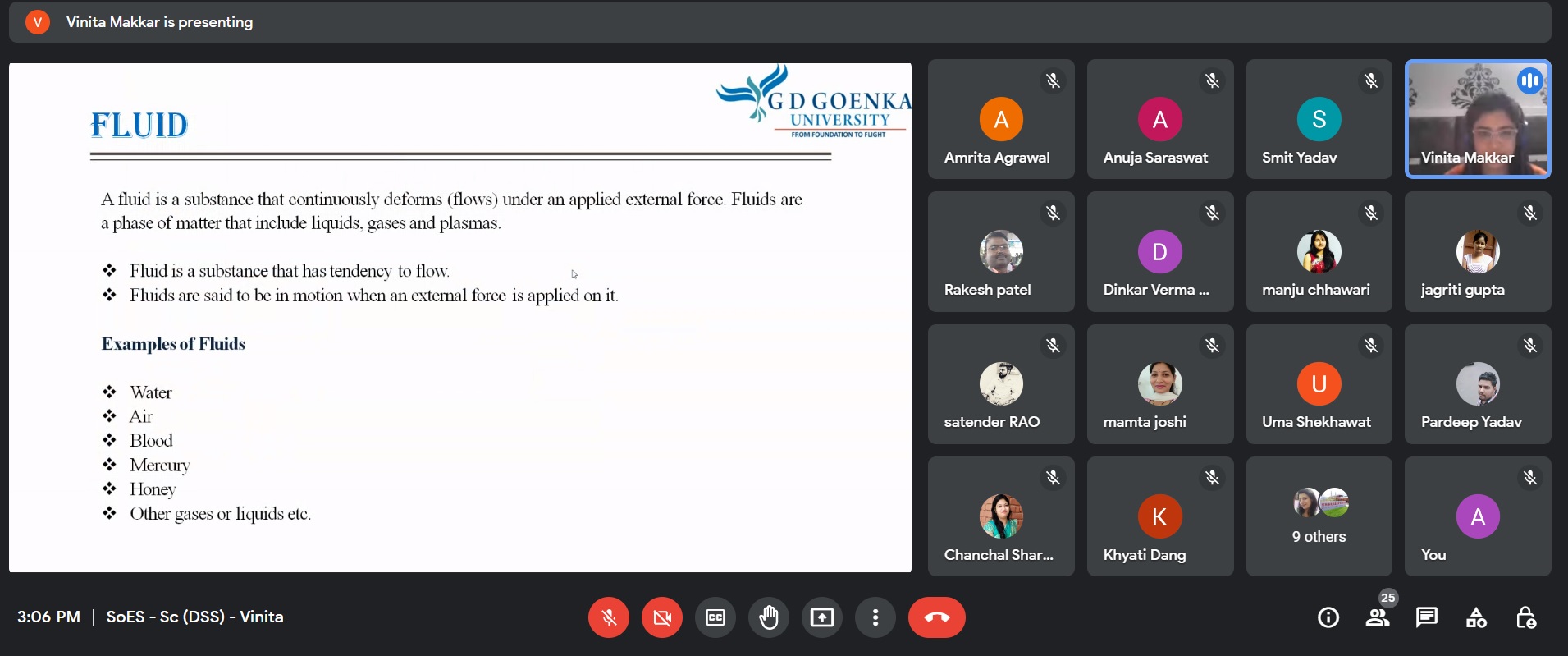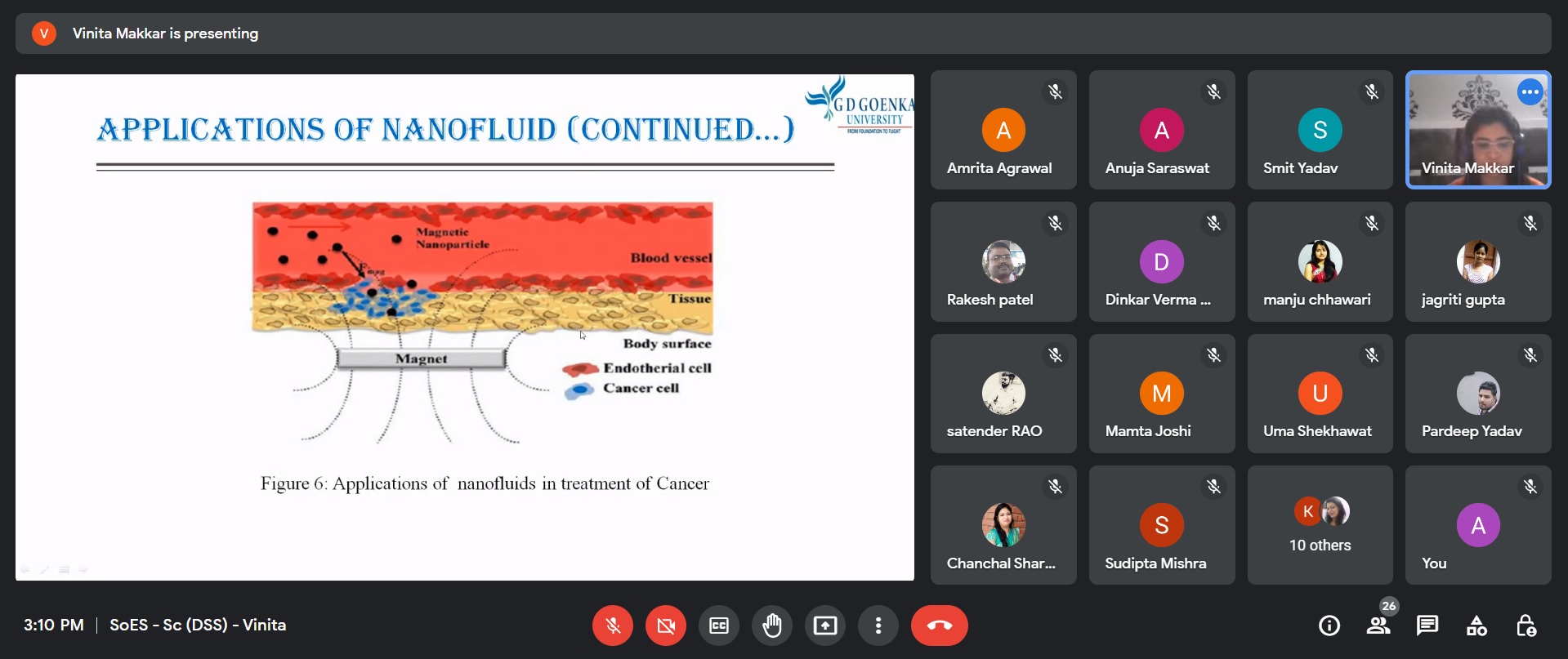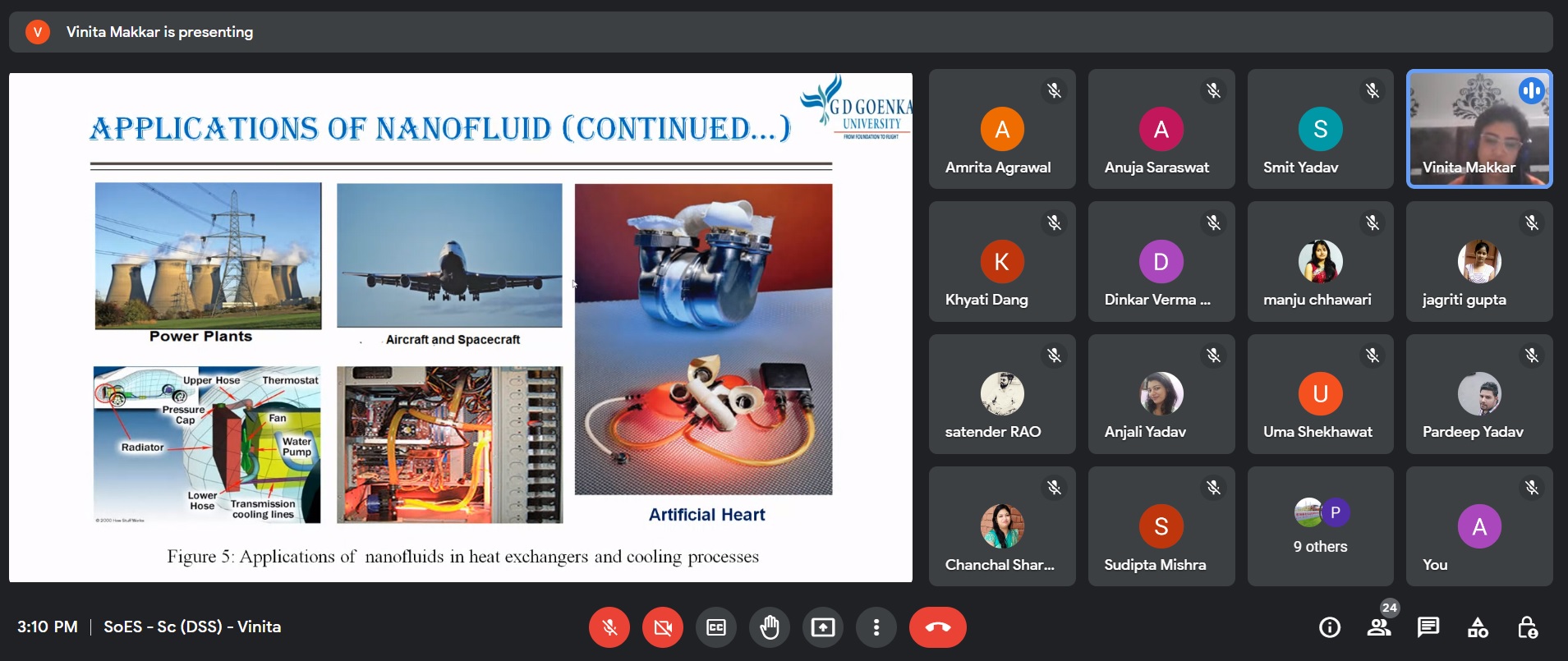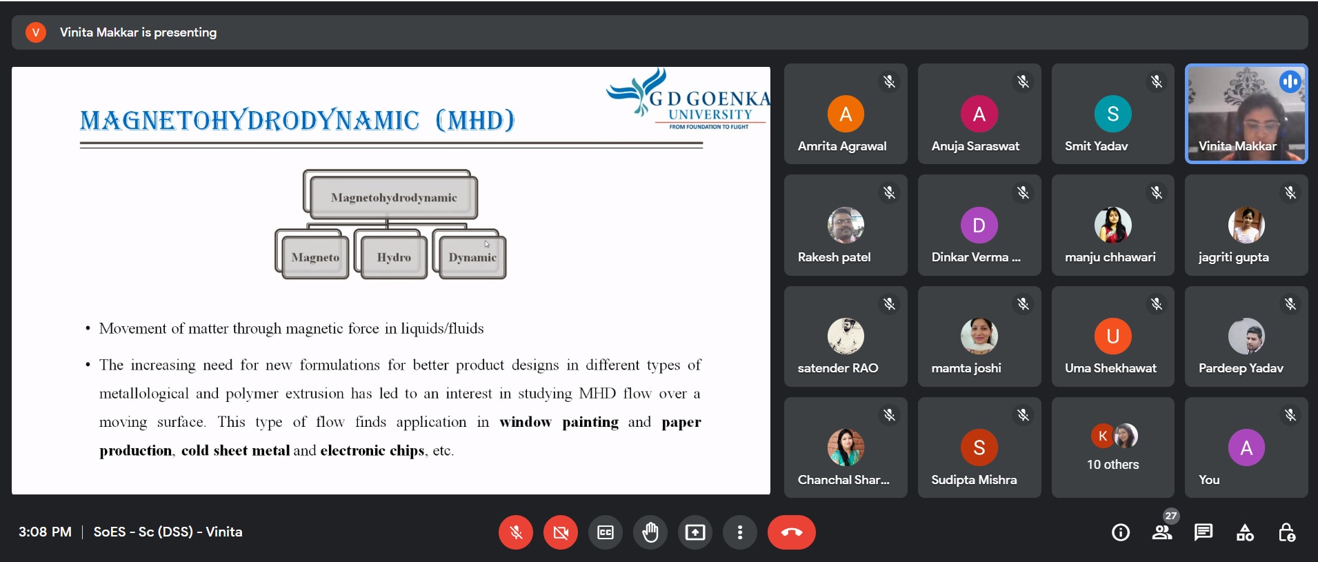School of Engineering & Sciences (SoES), GD Goenka University organized a Departmental Seminar Series on 28 July 2022. Ms. Vinita Makkar, a research scholar in Mathematics, under the supervision of Prof. (Dr.) Naresh Sharma, has delivered a talk on ‘A Mathematical Modelling of Magnetohydrodynamic Nanofluid Flow Induced by Three Dimensional Stretching Surface’.