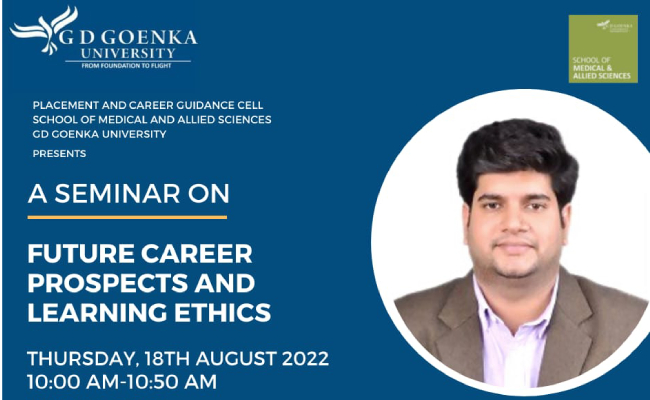 School of Medical and Allied Sciences, GD Goenka University conducted an expert talk on ‘Future Career Prospects and Learning Ethics’ on August 18, 2022 for the D.Pharmacy IInd Year students by Mr. Abhishek Sharma, assistant professor at GD Goenka University. Mr. Sharma guided and motivated the students in setting their career goals and also told about various prospect job/careers after Diploma in Pharmacy. He also informed the students about the importance of professional ethics related to patient care that need to be followed during pharmacy practice. He answered different queries from students related to the opportunities in India and abroad