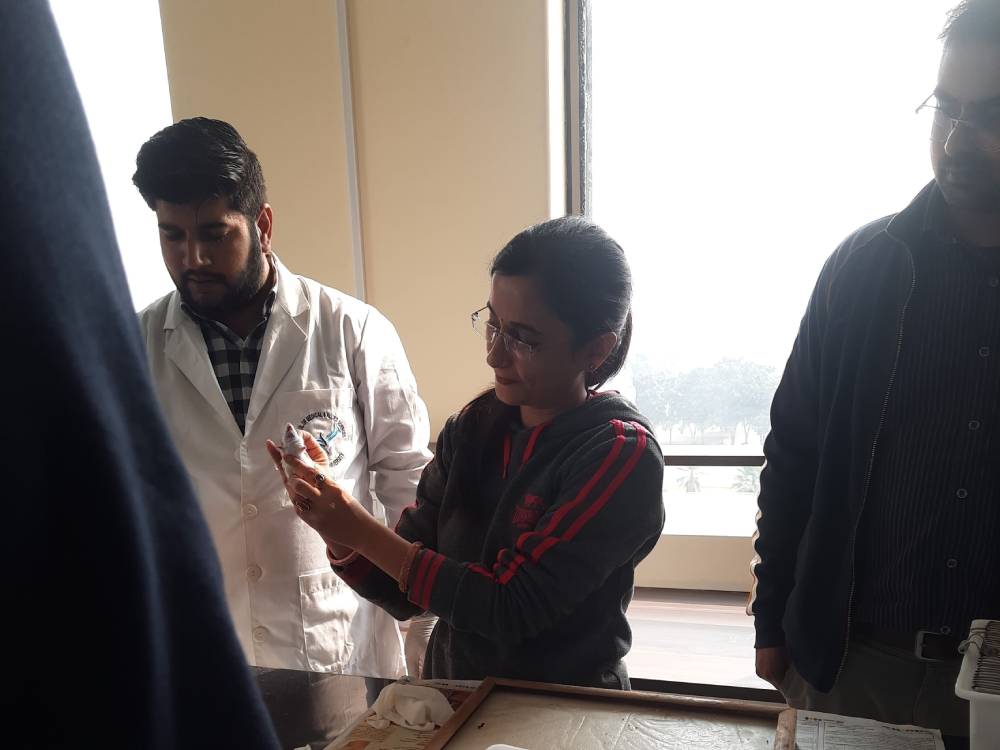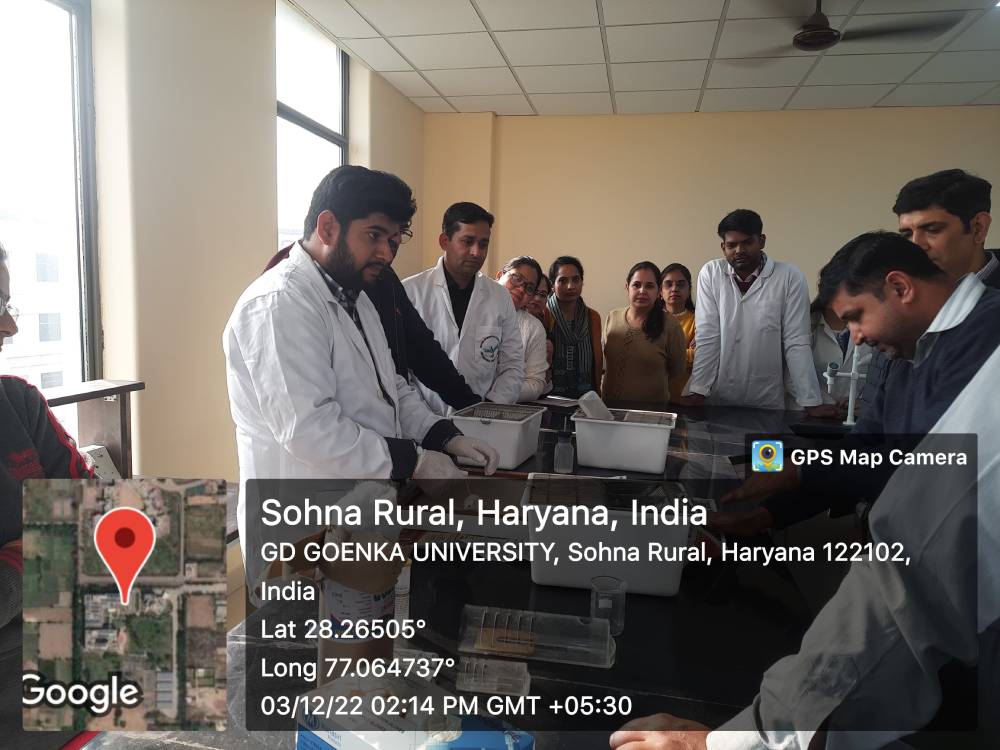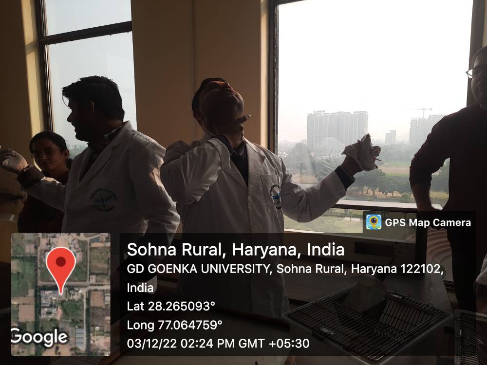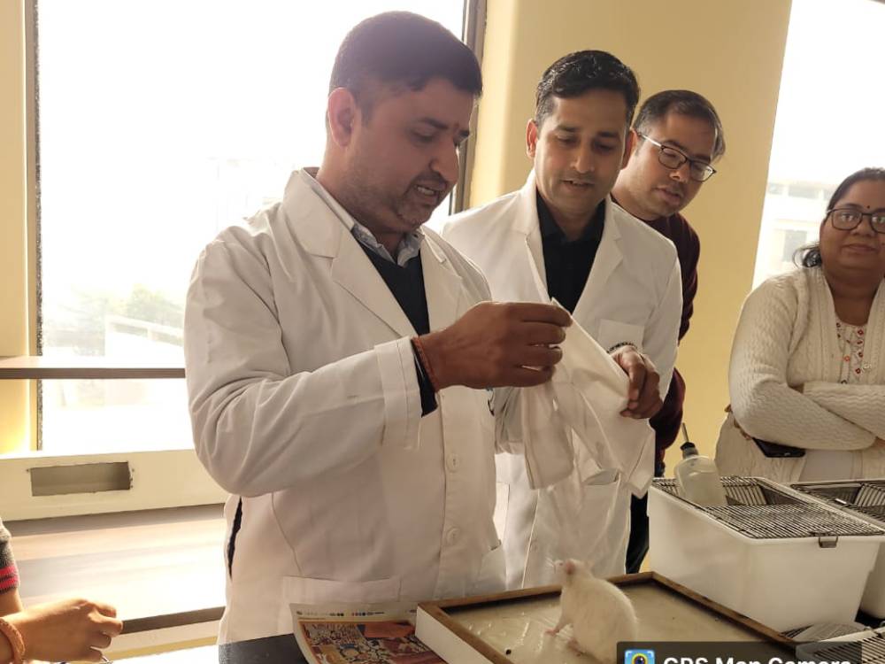 School of Medical and Allied Sciences, GD Goenka University organized a training session for the teaching staff on December 03, 2022. The session aimed at imparting the knowledge and practical skills pertaining to handling of the laboratory animals. Dr. Amit Nayak, Professor, SoMAS and Mrs. Ritu, Assistant Professor, SoMAS were the instructors in this training session. The session started with the basic classification of rats and mice, their diet and the presence of essential housing facilities. The instructors further demonstrated the technique of handling the animals (specially Wistar rat and Swiss albino mice). During the training session they explain dosing to these animals through different routes of administration- Intravenous, Intraperitoneal, Subcutaneous and Oral. They highlighted that the animals must be handled with extreme care during administration of the test solutions. Mrs. Ritu emphasized on the role of hygiene and sanitation in the animal house. In the presence of instructors, the faculty members had hands on training in handling rats and mice. This session culminated with strong bonds of knowledge about the basics of handling of laboratory animals.