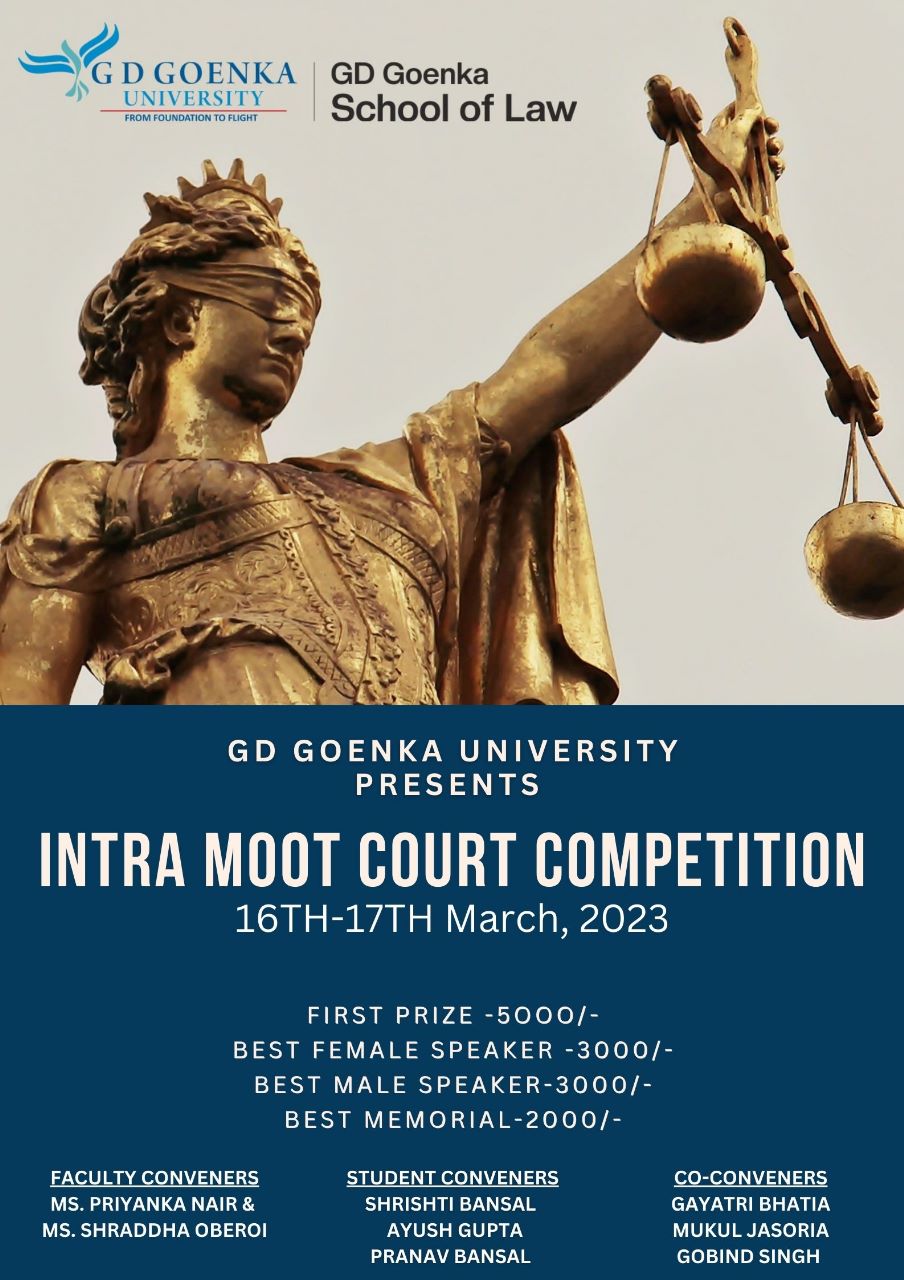 School of Law, G.D. Goenka University is delighted to announce that we are conducting an Intra Moot Court Competition on 16th - 17th March, 2023. The objective behind the competition is to nourish the oratory, argumentative and pleading skills of students with much attention being given to the art of research. Such clinical activities from the initial point of their careers will make sure that they are forearmed for the cut-throat competition in various verticals of the legal field.