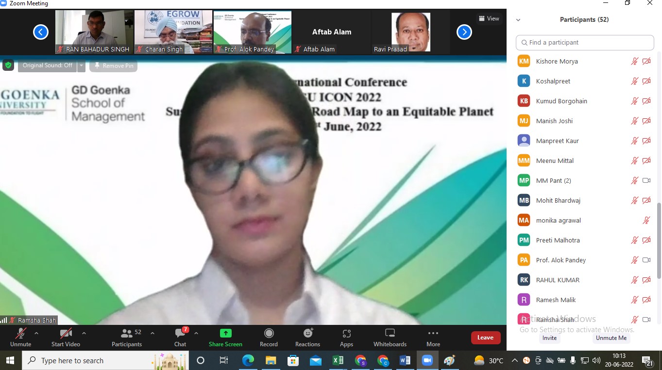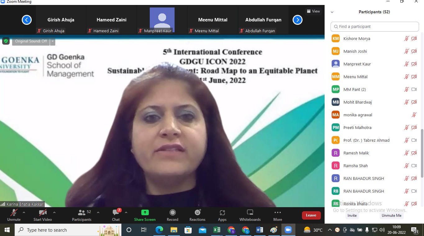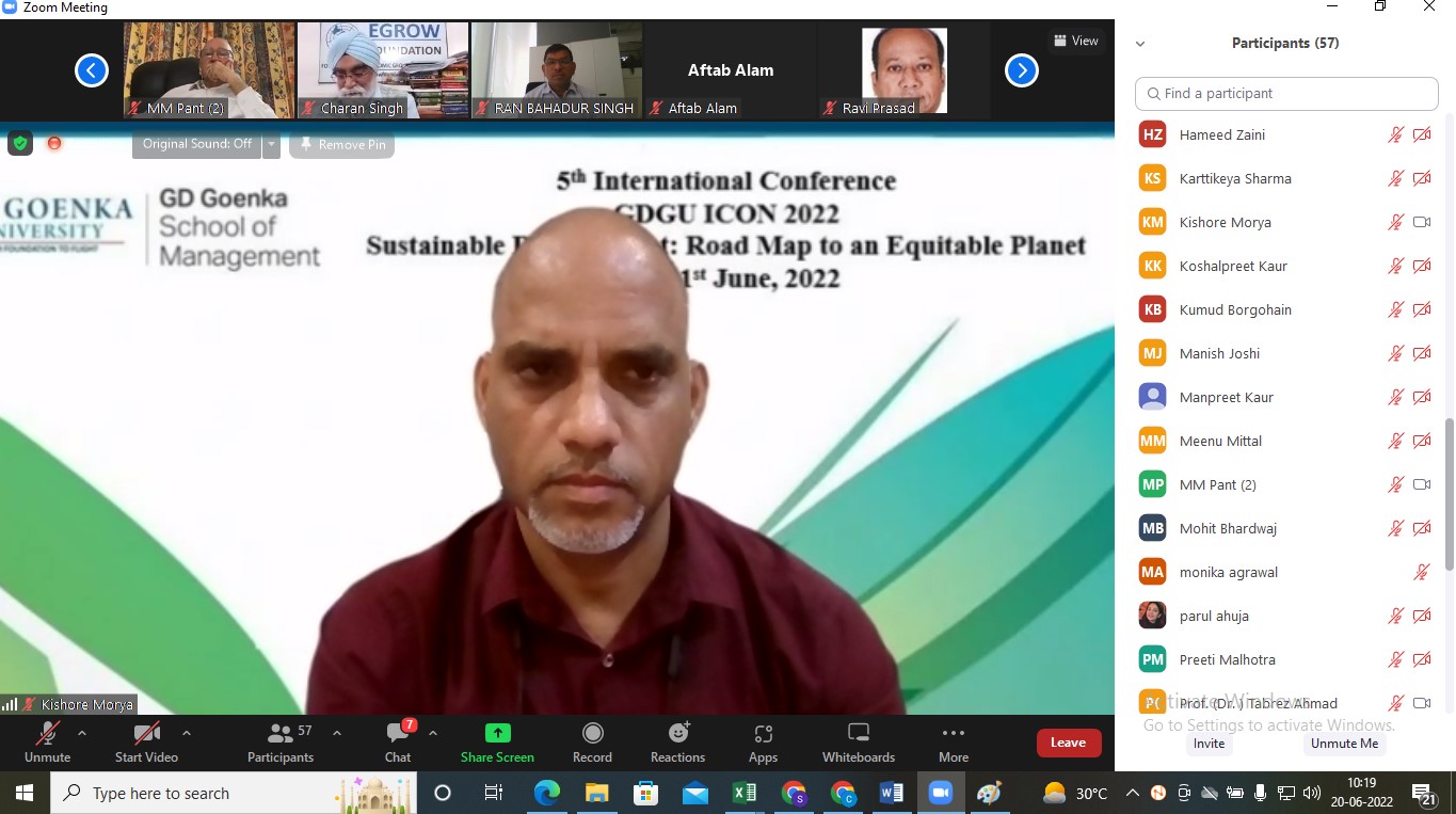 Welcome address was given by honourable Vice Chancellor, GD Goenka University, Prof. (Dr.)Tabrez Ahmad. Dean, School of Management, Prof. (Dr.) Alok Pandey introduced the conference themes and Area Chair, General Management, Dr. Karina Bhatia Kakkar gave an overview about the tracks. On day1, we were pleased to have the Chief Guest of the conference Dr. Charan Singh, CEO E-GROW Foundation and Former Non- Executive Chairman of Punjab & Sind Bank. He wonderfully explained the sustainable measures which are ingrained in the culture of India. Key Speaker in the Conference’s inaugural was Prof. (Dr.) Madan Mohan Pant, Professor & Founding Director of computing & Pro-Vice Chancellor, IGNOU. He explained about the traditional steps which Indians take for sustainable development. He also stressed on technology driven education to attain Millennium Development Goals and specifically SDG4. The conference comprised of four technical sessions on 20 June, 2022.The first technical session began with track titled Sustainable Finance, the second parallel track with track titled, Sustainable Technology and Management, the third and the fourth track with track titled as Sustainable Human Resource Management and Sustainable Marketing.