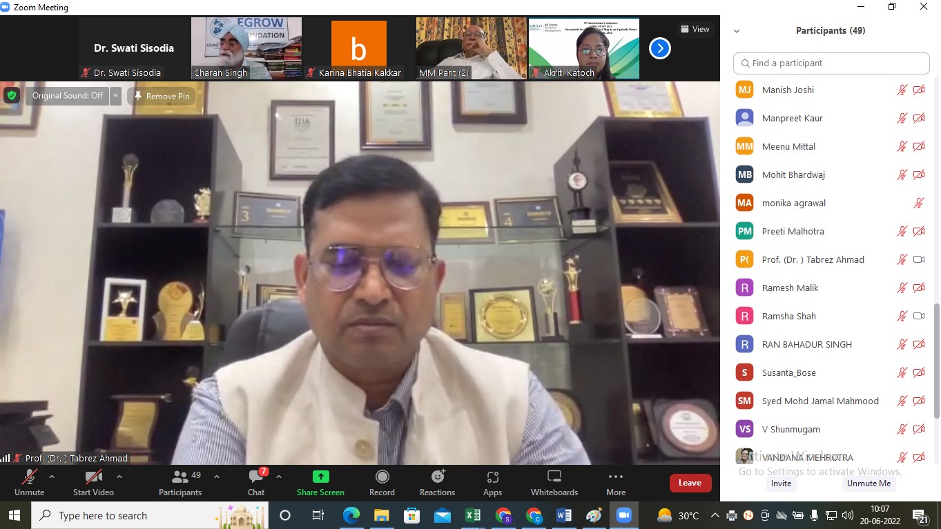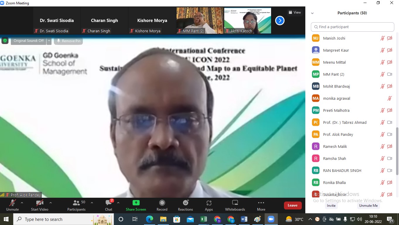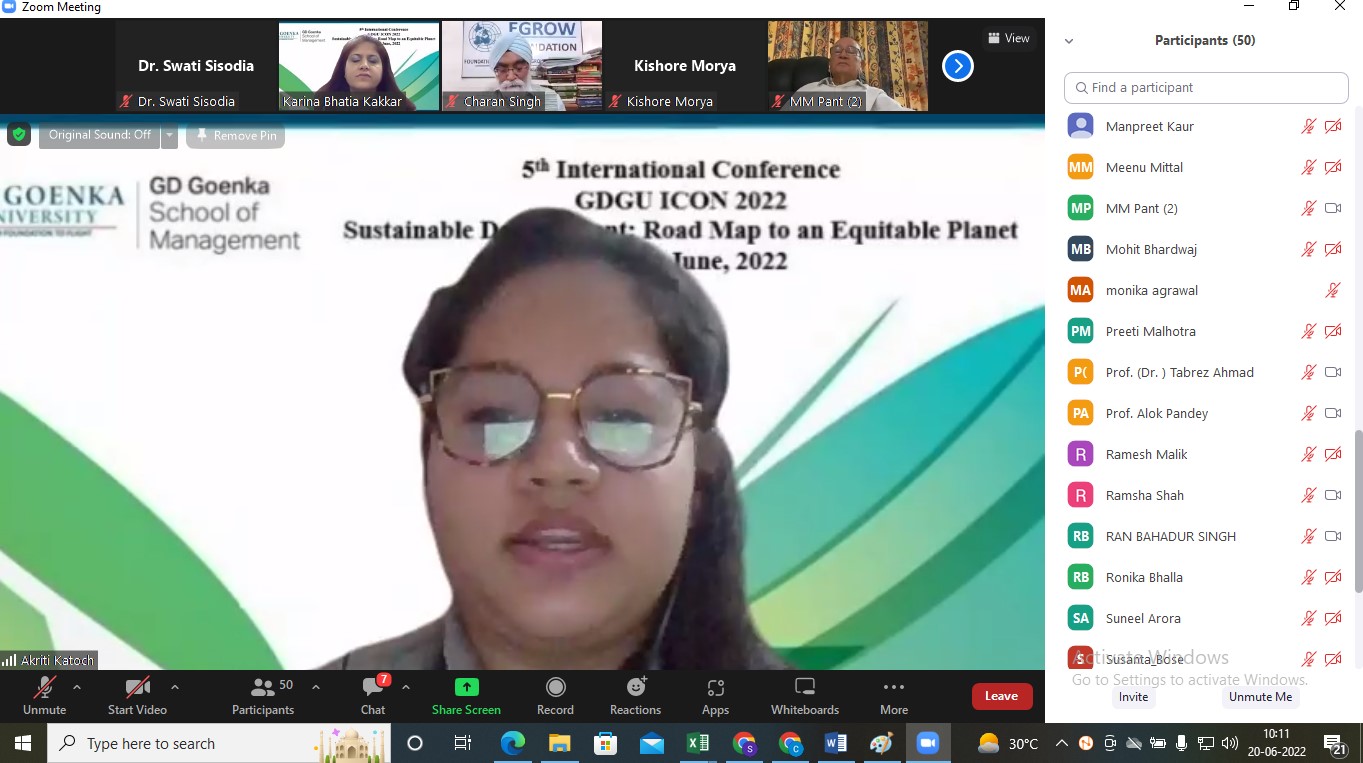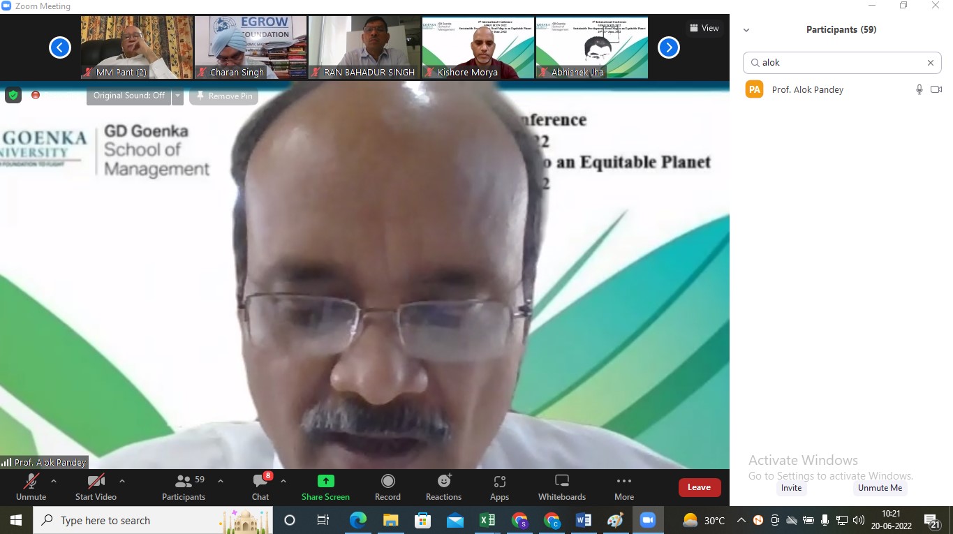 Welcome address was given by honourable Vice Chancellor, GD Goenka University, Prof. (Dr.)Tabrez Ahmad. Dean, School of Management, Prof. (Dr.) Alok Pandey introduced the conference themes and Area Chair, General Management, Dr. Karina Bhatia Kakkar gave an overview about the tracks. On day1, we were pleased to have the Chief Guest of the conference Dr. Charan Singh, CEO E-GROW Foundation and Former Non- Executive Chairman of Punjab & Sind Bank. He wonderfully explained the sustainable measures which are ingrained in the culture of India. Key Speaker in the Conference’s inaugural was Prof. (Dr.) Madan Mohan Pant, Professor & Founding Director of computing & Pro-Vice Chancellor, IGNOU. He explained about the traditional steps which Indians take for sustainable development. He also stressed on technology driven education to attain Millennium Development Goals and specifically SDG4. The conference comprised of four technical sessions on 20 June, 2022.The first technical session began with track titled Sustainable Finance, the second parallel track with track titled, Sustainable Technology and Management, the third and the fourth track with track titled as Sustainable Human Resource Management and Sustainable Marketing.