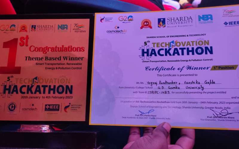 Congratulations to Yograj Rundhanker (B.Tech. CSE (AIML)) and Vanshika Gupta (B.Tech. CSE) on winning First Position at 5th Technovation Hackathon organized at Sharda University, Ghaziabad, on 3rd and 4th of February 2023.