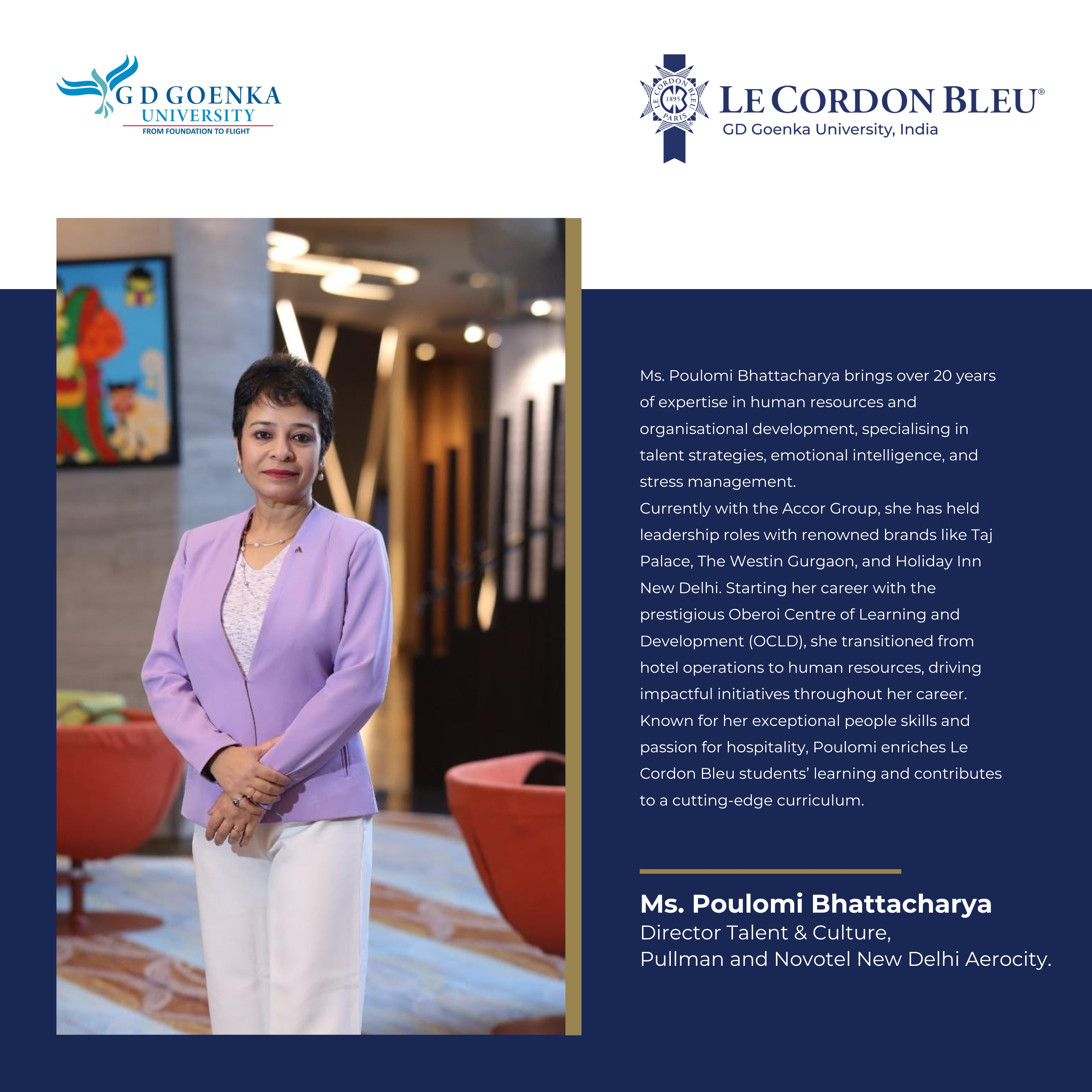 The India campus of the renowned culinary institute Le Cordon Bleu is located within GD Goenka University's prestigious School of Hospitality and Tourism in Gurugram. Established in 2013, it offers a variety of programmes including short courses, one-year diplomas, four-year undergraduate degrees, and two-year master’s degrees. The curriculum is designed to align with industry demands, focusing on experiential learning to prepare students for real-world careers.
